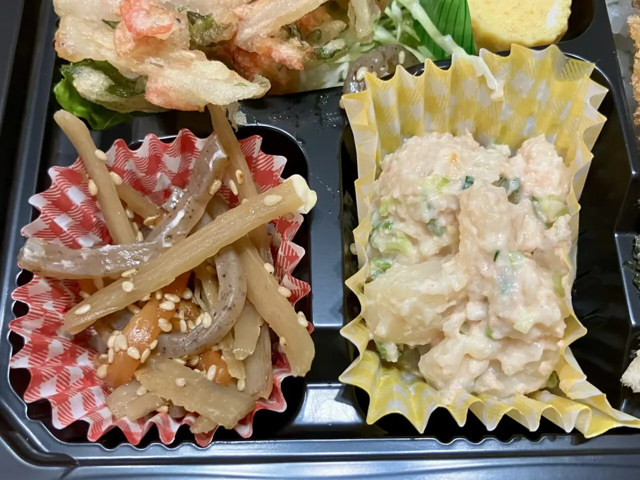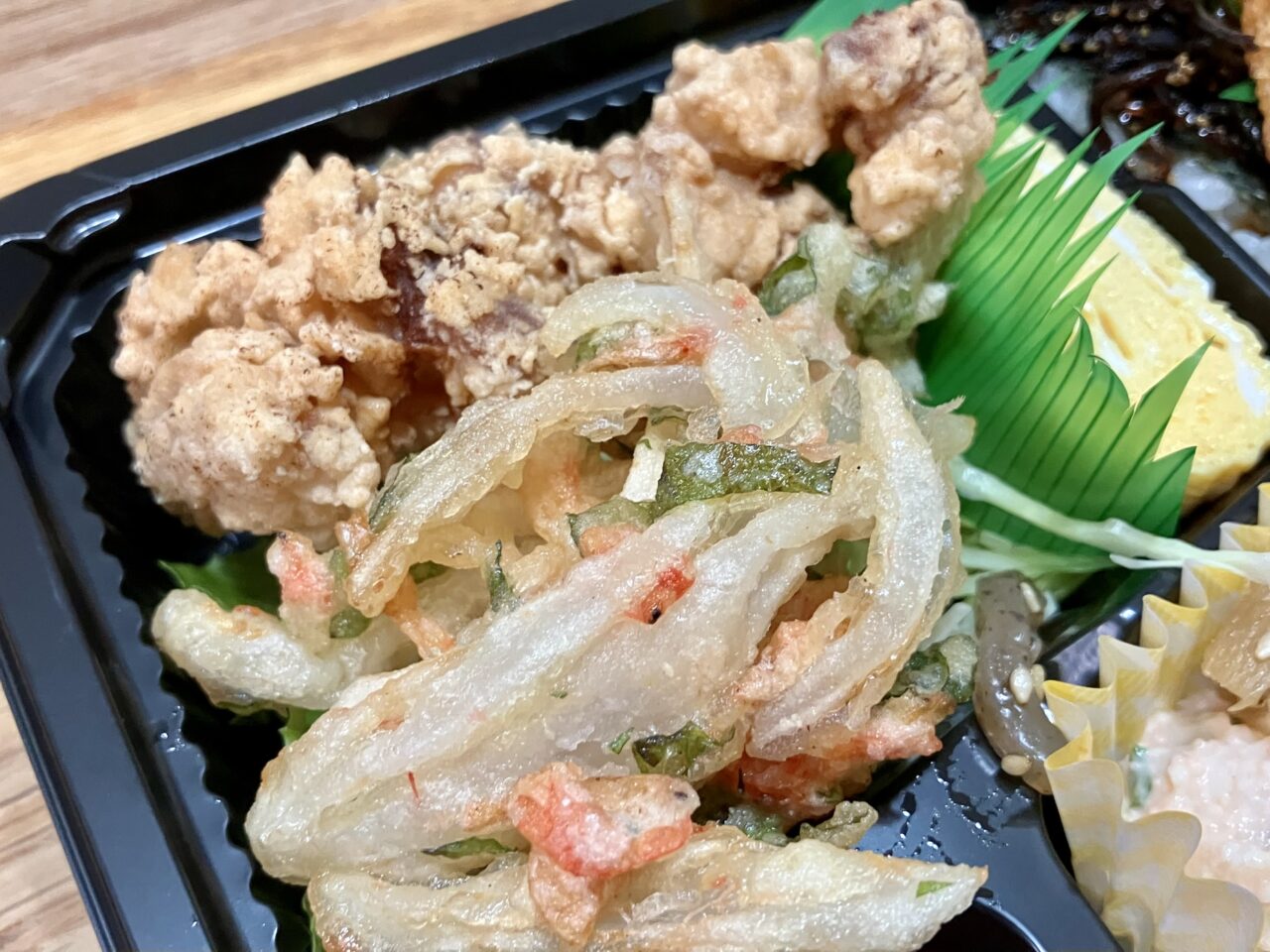 副菜のきんぴらごぼうはピリッと唐辛子がきいていて、しっかりご飯のおかずになる味付け。じゃがいもの明太マヨ和えは優しい味わい。玉子焼きは甘めで、ちゃんと簀巻きされていて、手間がかかっていて美しいです。立地上、学生さん向けのお弁当なのかと思っていましたが…これは仕出し屋さんのクオリティのお弁当!これだけ手間のかかったお弁当がこの値段は安すぎるのではと思いました。かき揚げ、唐揚げ、磯辺揚げもついていて男性も満足感のあるお弁当。