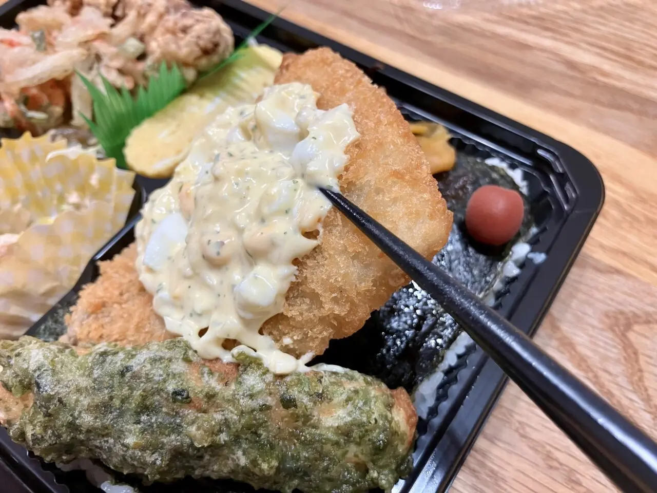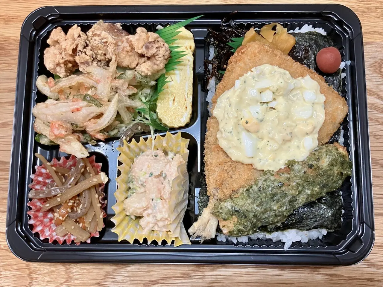 渡された時、重い!と思いました。それもそのはず…おかずの量が凄い。アジフライ、かき揚げ、鶏唐揚げ、ちくわ磯辺揚げ、卵焼き、きんぴらなどの副菜が2種類。
