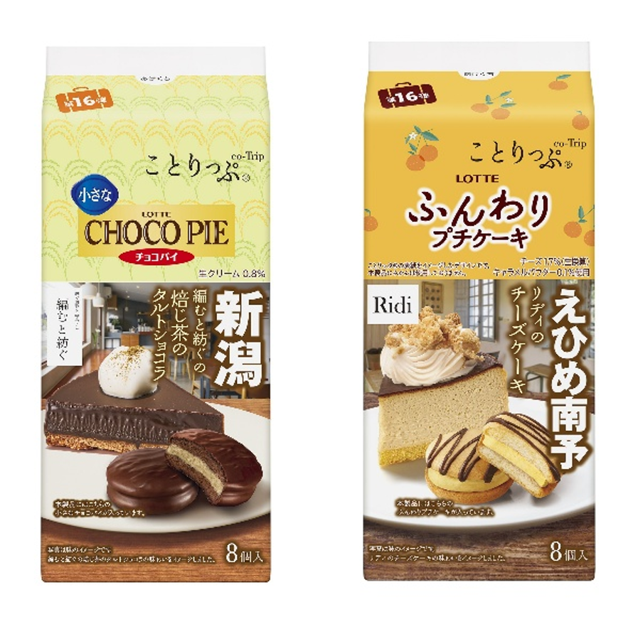 今回の企画は既に第16弾と、人気のコラボレーション企画。今回は「地元で愛される名店」がテーマで、ロッテとことりっぷ、そして地元自治体観光担当者、さらに地元で愛されている名店の4社が共同開発した自信作とのこと!新潟「ことりっぷ 小さなチョコパイ<編むと紡ぐの焙じ茶のタルトショコラ>」とえひめ南予「ことりっぷ ふんわりプチケーキ<リディのチーズケーキ>」が発売となりました。