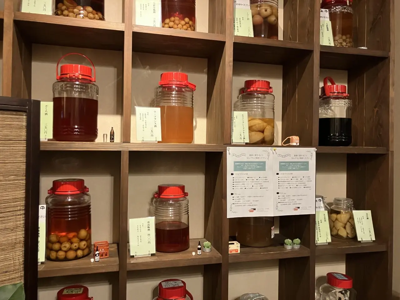お店の入口にディスプレイされている圧巻の果実酒。全て自家製です。コーヒー酒や柿酒、ラ・フランス酒など…他ではいただけない珍しい果実酒がたくさん。