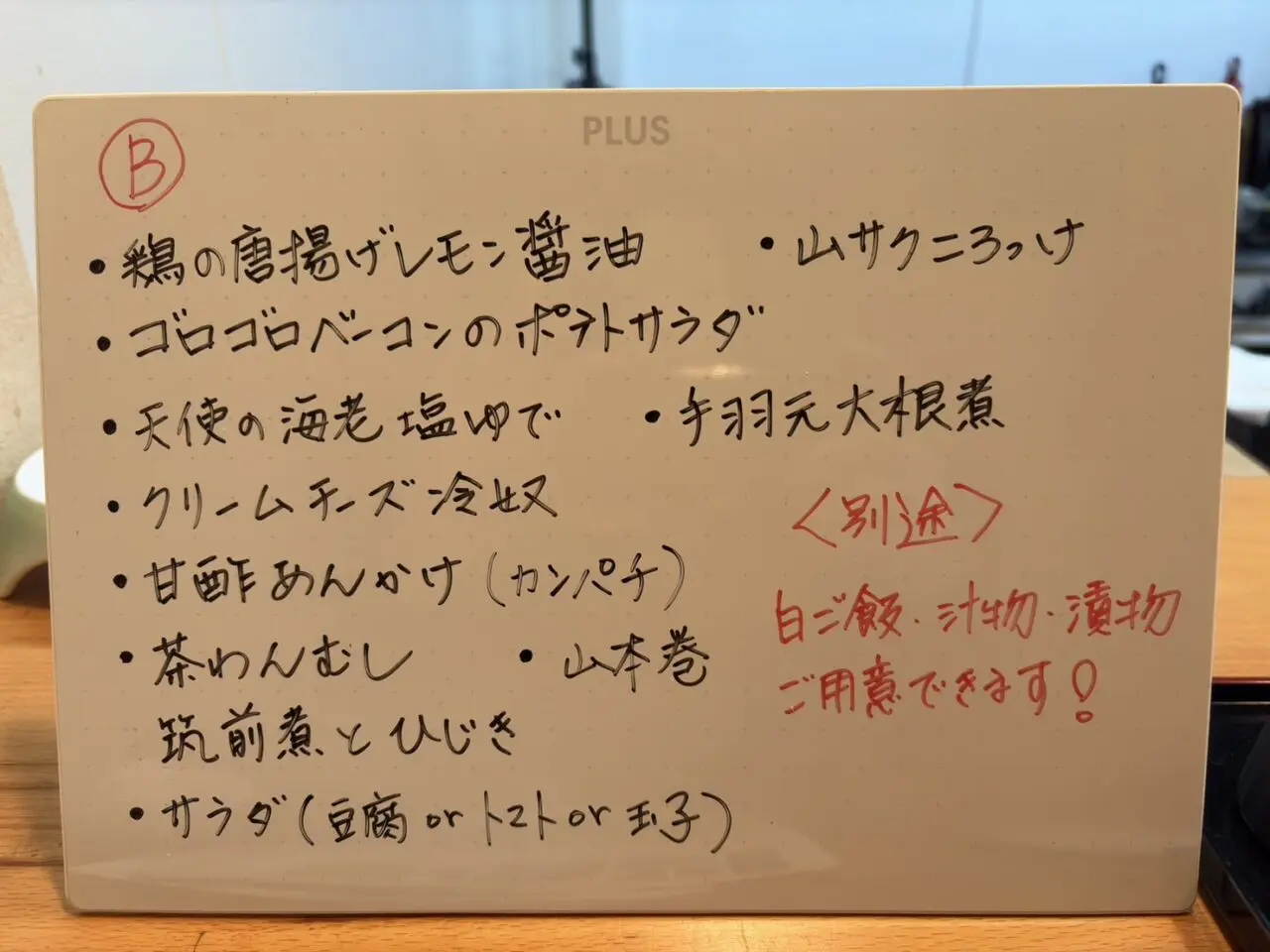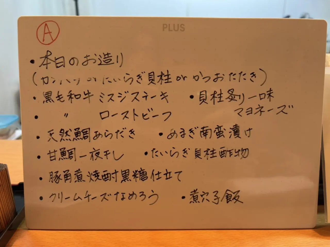 山本膳はお品書きから自由に料理を選ぶことができます。六彩は六品、八重は八品選べます。八重はホワイトボードAとホワイトボードBから四品ずつ選びます。