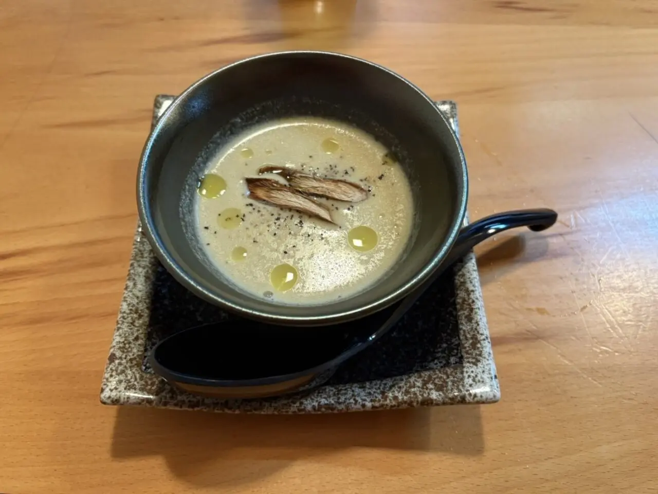 香ばしいごぼうの風味で和の優しさを感じるポタージュ。繊維感もなく、裏ごしの丁寧さを感じられ、上品で料理の期待が高まります。