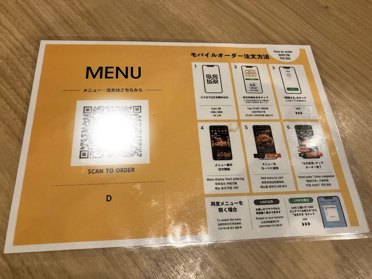まず、メニュー表記。英語、韓国語、中国語…と様々な言語で書かれており、インバウンドのお客さんにも対応しています。私がお伺いした日曜日のお昼は、たくさんのお客さんで賑わっていましたが日本の方が多かったです。店員さんも元気で居心地が良かったです。そしてメニューはスマホで注文。