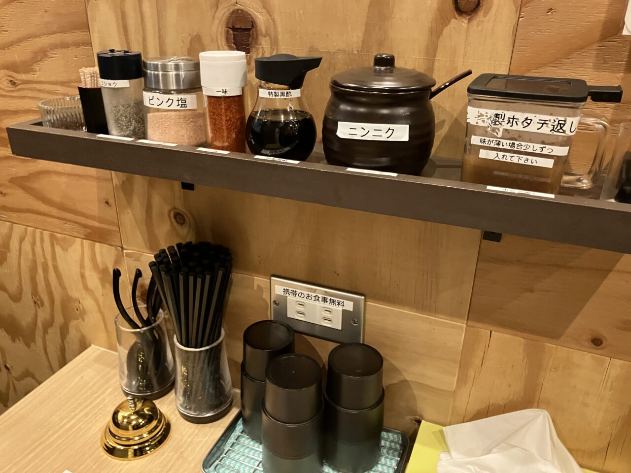 「携帯のお食事無料」のコンセントもあり、至れり尽くせり。メニューは以前は定番の帆立豚骨ラーメンと、焦がしにんにくが香るブラック、旨辛なレッドの3種類でしたが…種類がめちゃくちゃ増えてる!