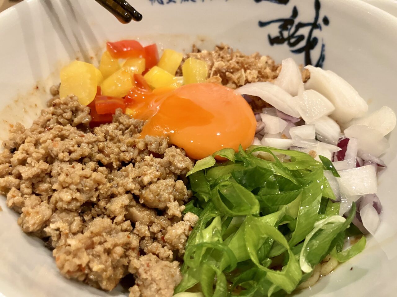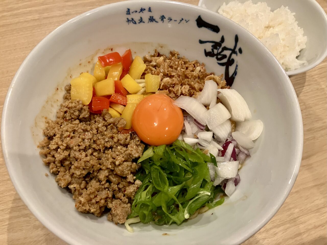 途中で卵黄を混ぜてまろやかにすることもできますし、最後にご飯を入れるのもおすすめです。一杯でいろいろ味わえるまぜそば!