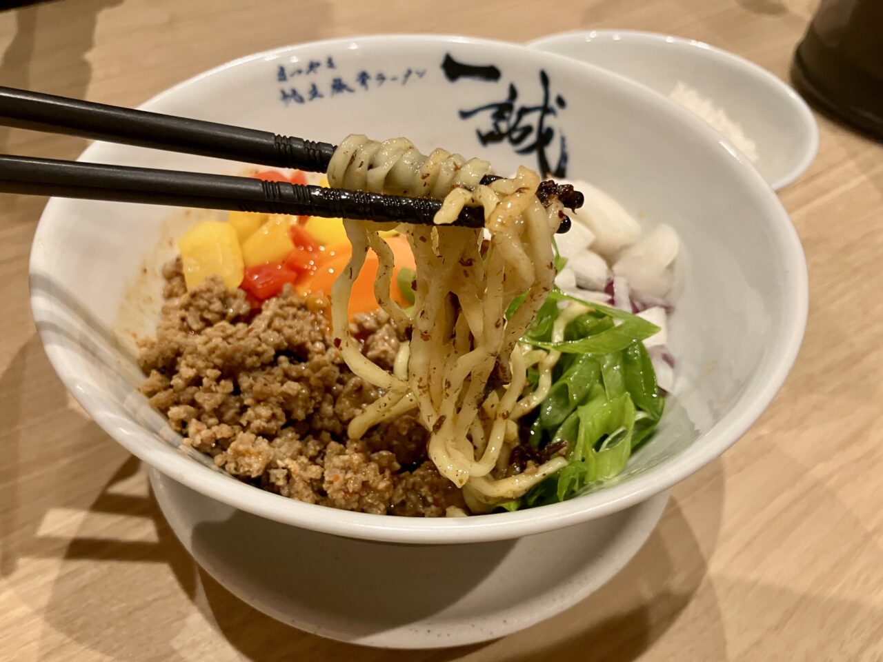 最初に見た時、まぜそばにパプリカのピクルス?と驚きましたが、ピクルスの調味液の砂糖の甘みとお酢の酸味がこのまぜそばにものすごく合う!いろいろな味が複雑に絡み合って、辛いのはあまり得意ではないですが、このまぜそばはとても美味しいと思いました。卓上の特製黒酢をかけて食べるとまた違う味わいになります。