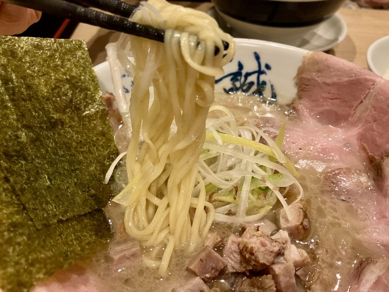炭火の良い香りで、食べごたえもあり、口に入れるとほどける柔らかさ。崩したチャーシューもあり、2つの食感を楽しめます。こちらは平細麺と中太ちぢれ麺が選べるとのことで、平細麺にしてみました。