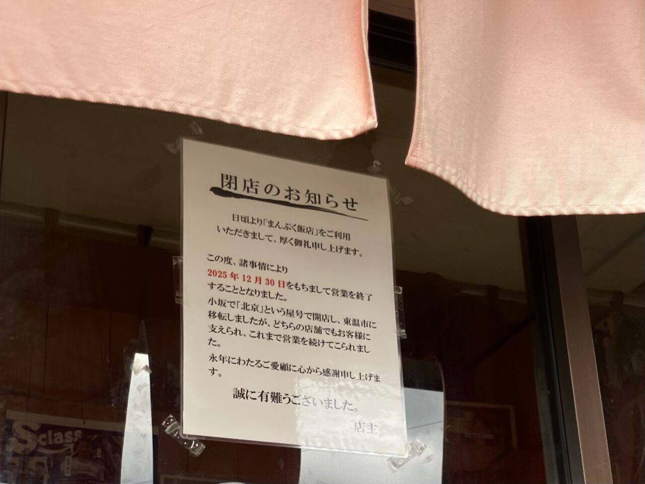 お店の貼り紙によると、「諸事情により2025年12月30日をもちまして営業を終了することとなりました」とありました。また続いて、