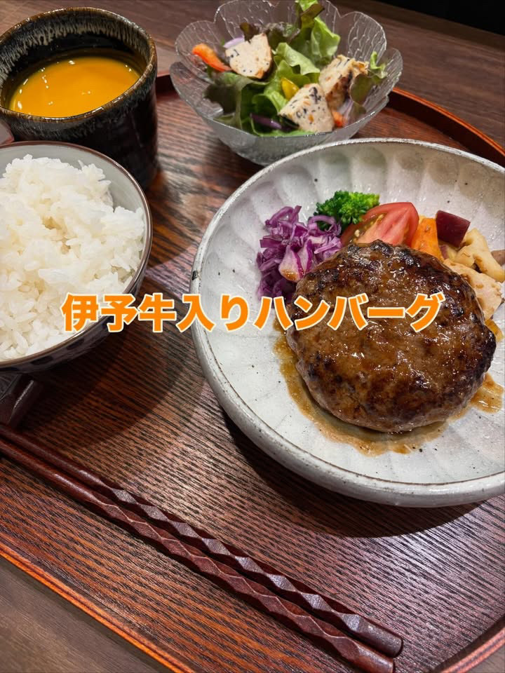 伊予牛を30%使用し、肉の旨味とバランスを考慮して作られたこだわりのハンバーグ。ソースは日替わりだそうです。副菜とスープ付きです。