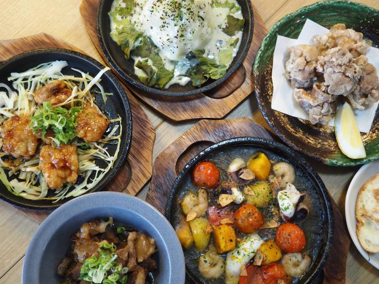 お昼はランチメニューとテイクアウトのみ。夜は鉄板焼きのほか、アヒージョや牛すじ煮込みなどの居酒屋メニューもあるようです。
