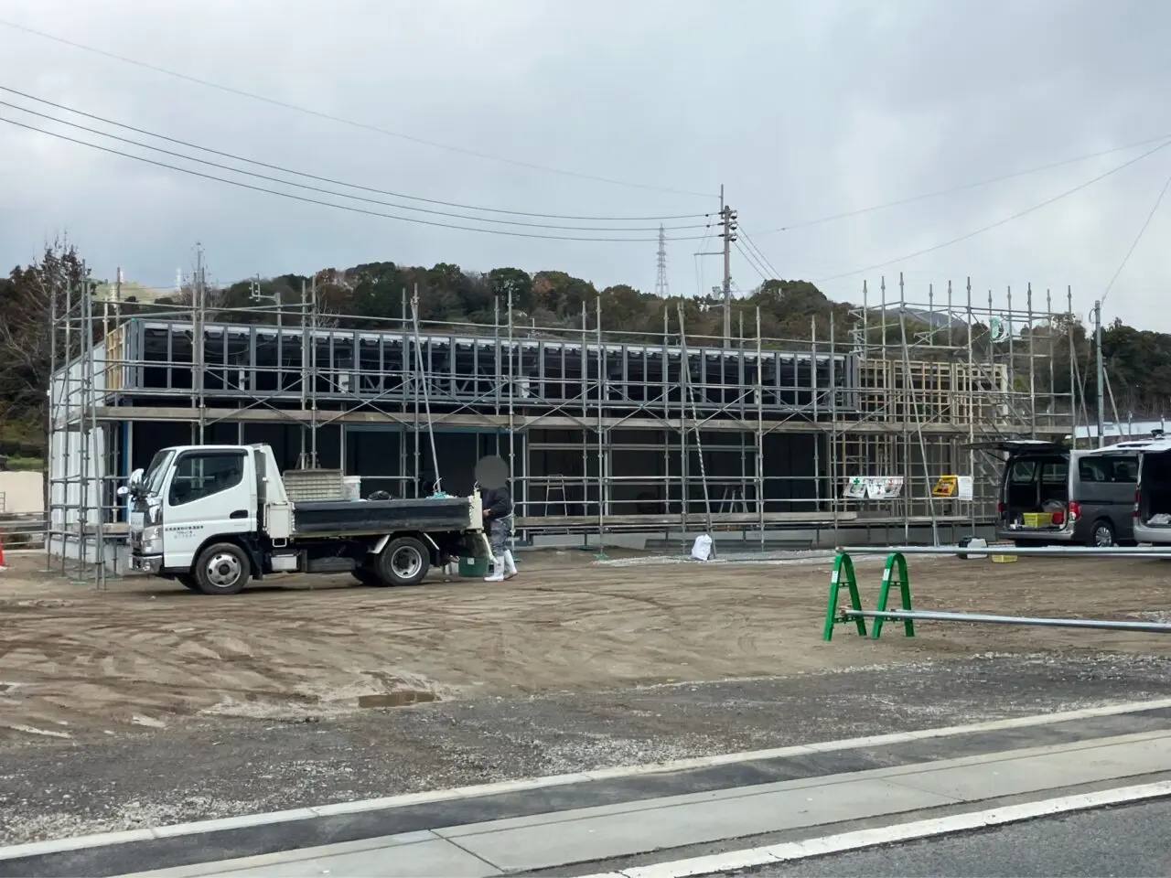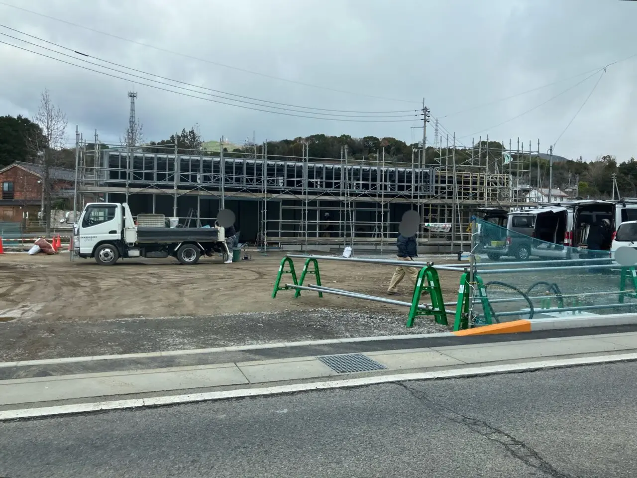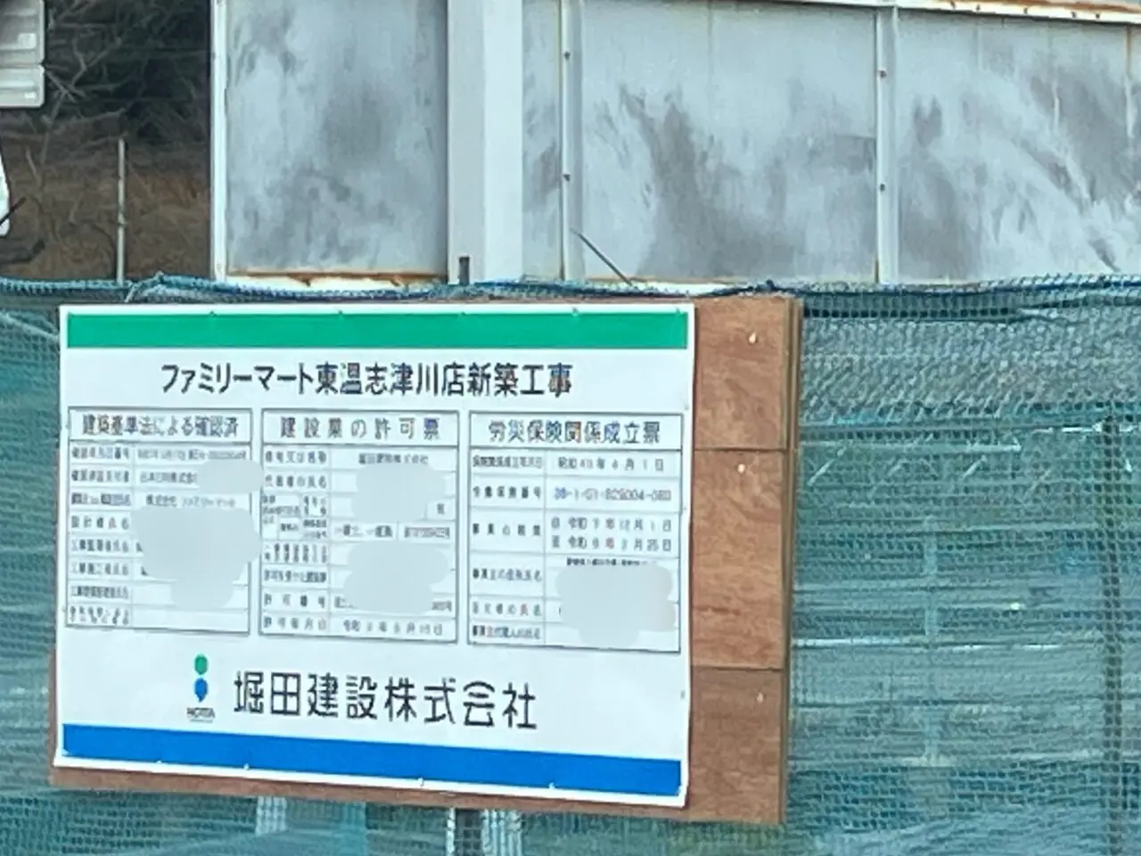 住宅地と幹線道路が近い立地で、日常使いしやすいエリアです。2025年12月下旬に訪れた時は足場が組まれ、建物が建設中でした。看板を確認すると「ファミリーマート東温志津川店新築工事」とありました。