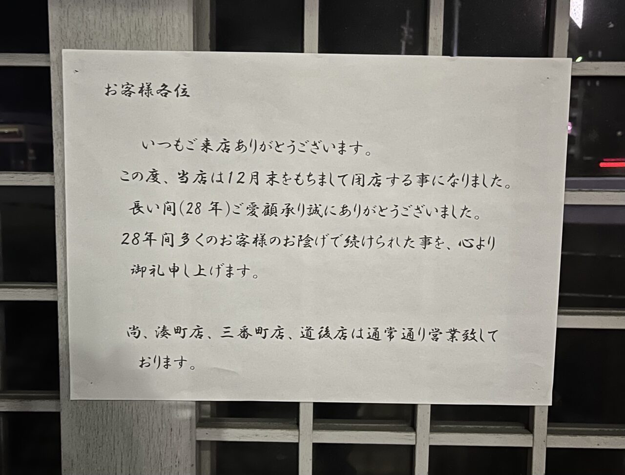 情報提供者さまからいただいた写真では「当店は12月末をもちまして閉店することになりました。」という閉店する旨、また「長い間(28年)ご愛顧誠にありがとうございました。」と地域のお客さんへの長年の感謝の言葉とともに、28年にわたる営業への区切りが示されていました。