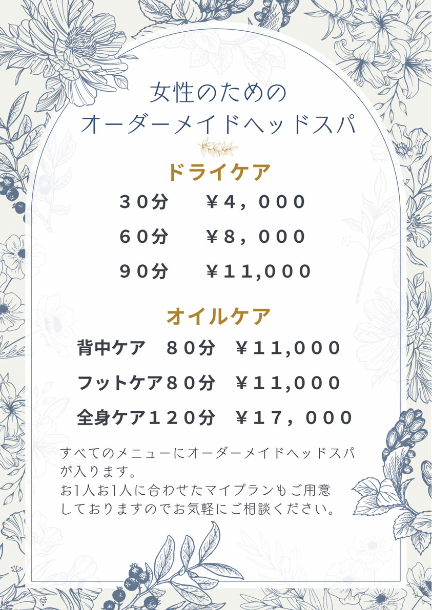 ・オーダーメイドヘッドスパ&首・デコルテ30分…4,000円(着替え不要)
