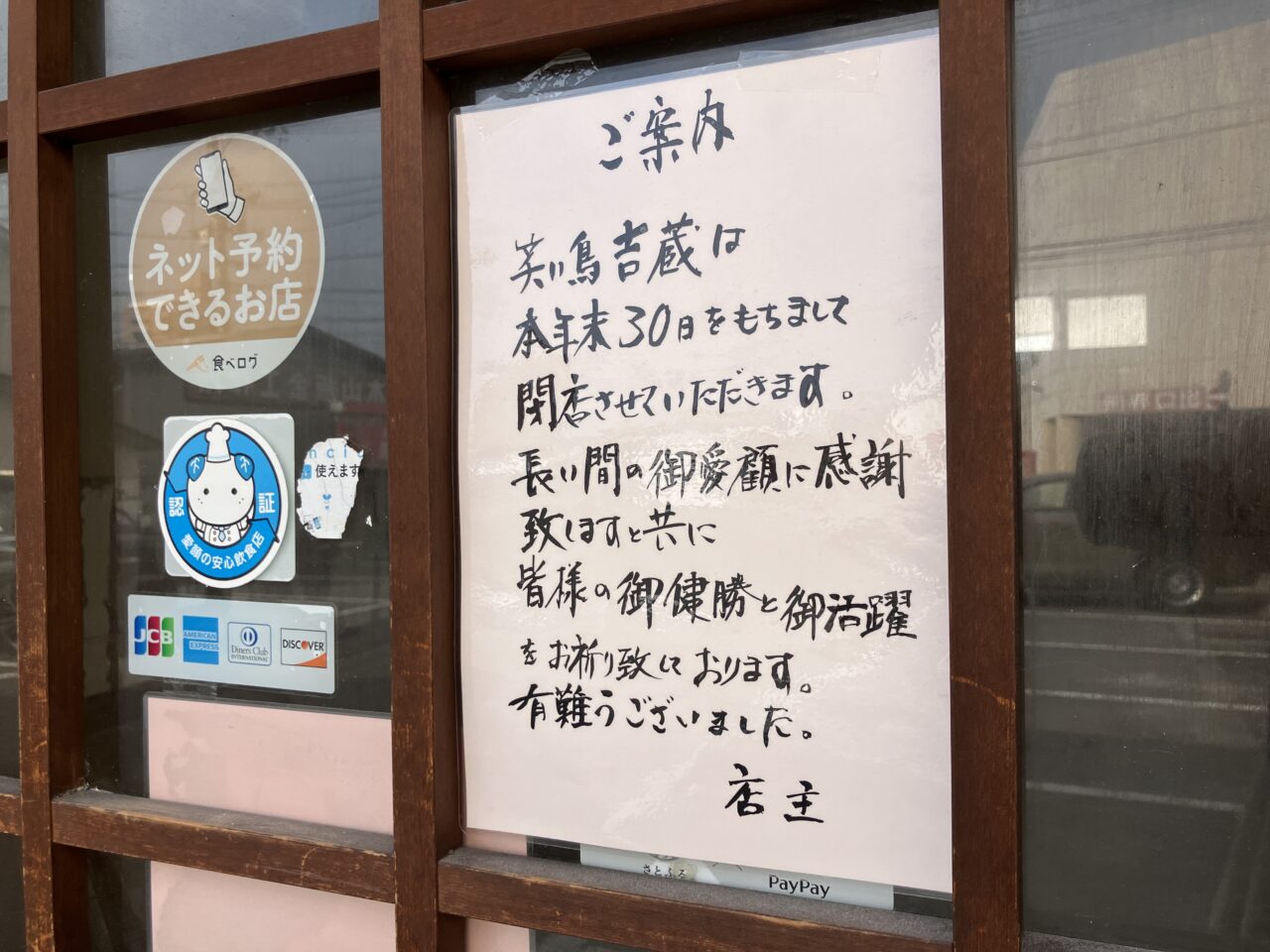 【松山市】ジョー・プラ西側の「笑い鳥 吉蔵」が2025年12月30日閉店していました。