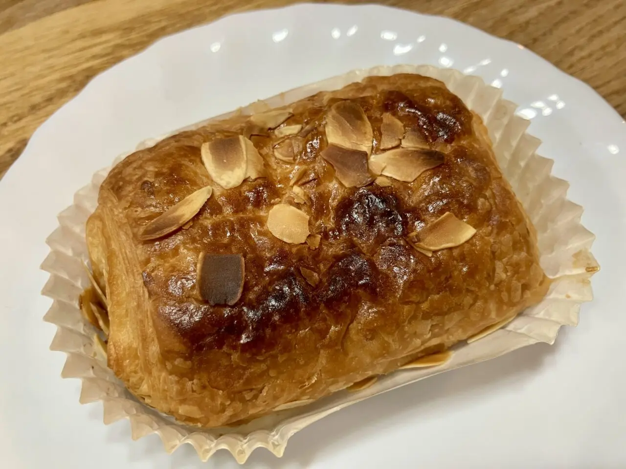 デニッシュは柔らかく軽い生地感で、表面のアーモンドスライスが良いアクセントに。甘すぎないビターチョコとの相性も抜群で、昼下がりのコーヒータイムにもピッタリ。