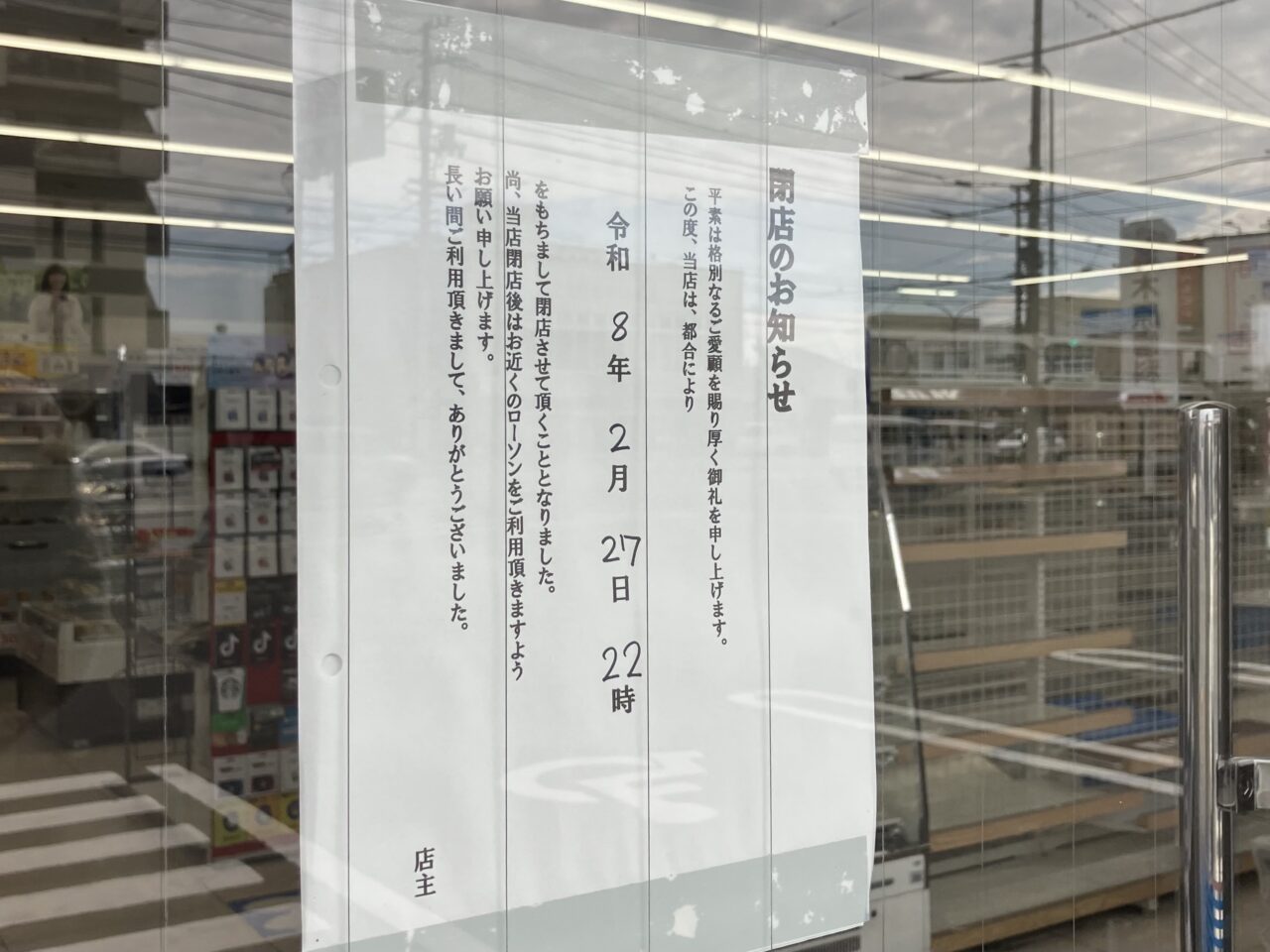 「令和8年2月27日22時をもちまして閉店させて頂くこととなりました。」とあります。2月26日に行ってみたのですが、店内にはもう商品がかなり少なくなっていました。同じ通りに、セブンイレブン松山問屋町店、ローソン松山東長戸一丁目店があります。隣には、中華料理屋のハルピンもオープン予定です。