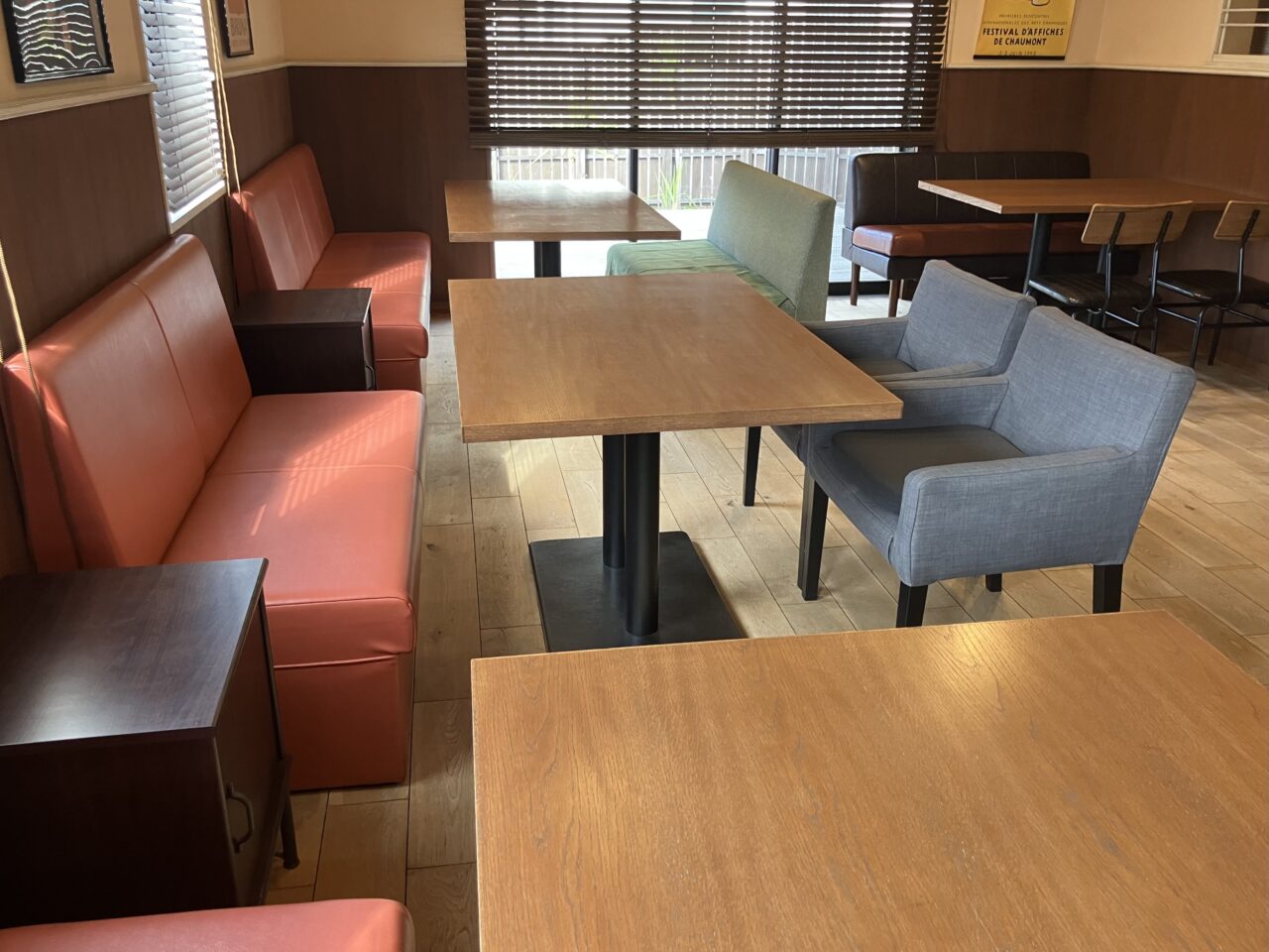 店内は想像以上に広々。落ち着いた雰囲気で、カウンター越しに調理風景が見えるオープンキッチンがおしゃれ。テーブルが6卓あり、ゆったりと座れるソファ。一人利用しやすいカウンター席もありました。