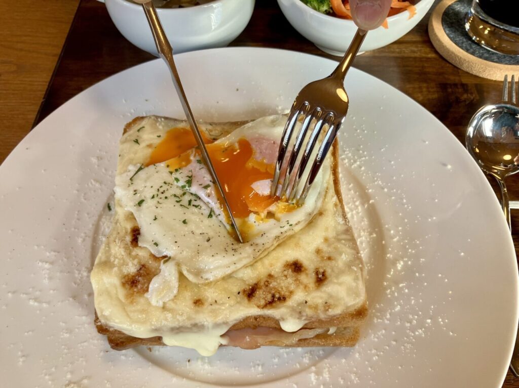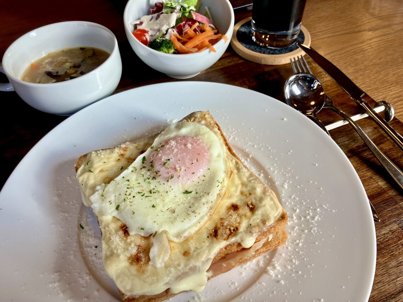 とろっとした半熟卵となめらかなベシャメルソースの一体感が良く、中にはハムもサンドされていました。耳はカリカリ、中はチーズとソースがとろけて、シンプルながら完成度の高い一皿。