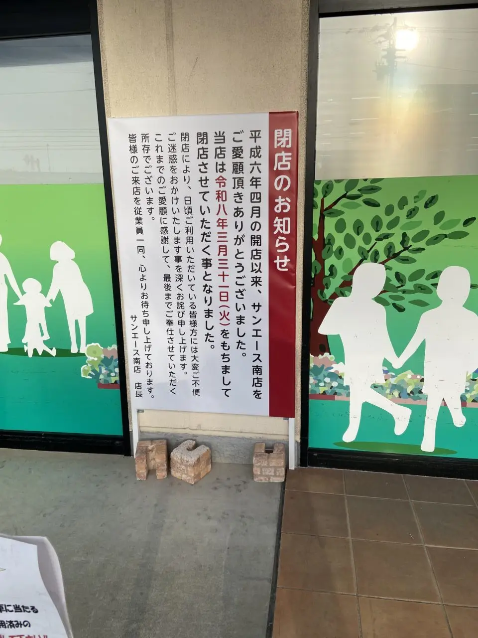号外NET中予読者様から情報提供いただきました。河野中須賀にあるスーパー「サンエース南店」が、2026年3月31日で閉店することが分かりました。店舗前に貼ってあった閉店のお知らせの写真もいただきました。