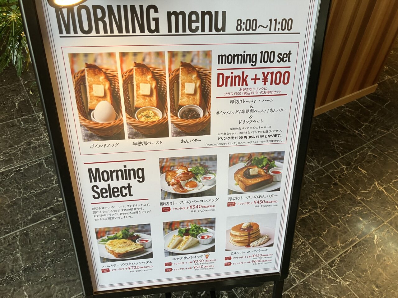 注文は各テーブルに用意されたQRコードを読み取って行うシステムです。モーニング(8:00〜11:00)はドリンク代にプラス料金で楽しめるセットが非常にお得です。