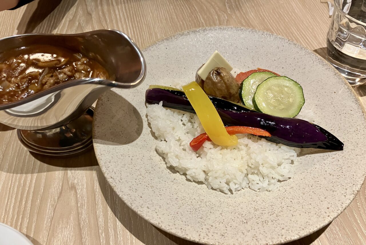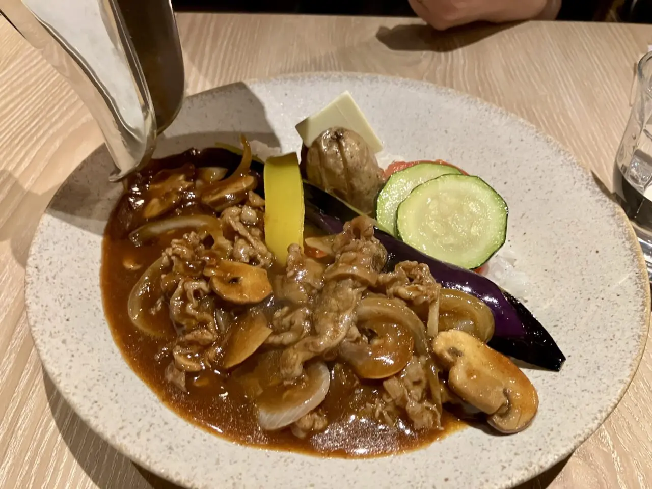 素揚げされた色鮮やかな野菜が添えられ、見た目も華やかな彩り野菜の自家製ビーフハヤシライス(1,320円)。コクのあるルウが評判の一品です。