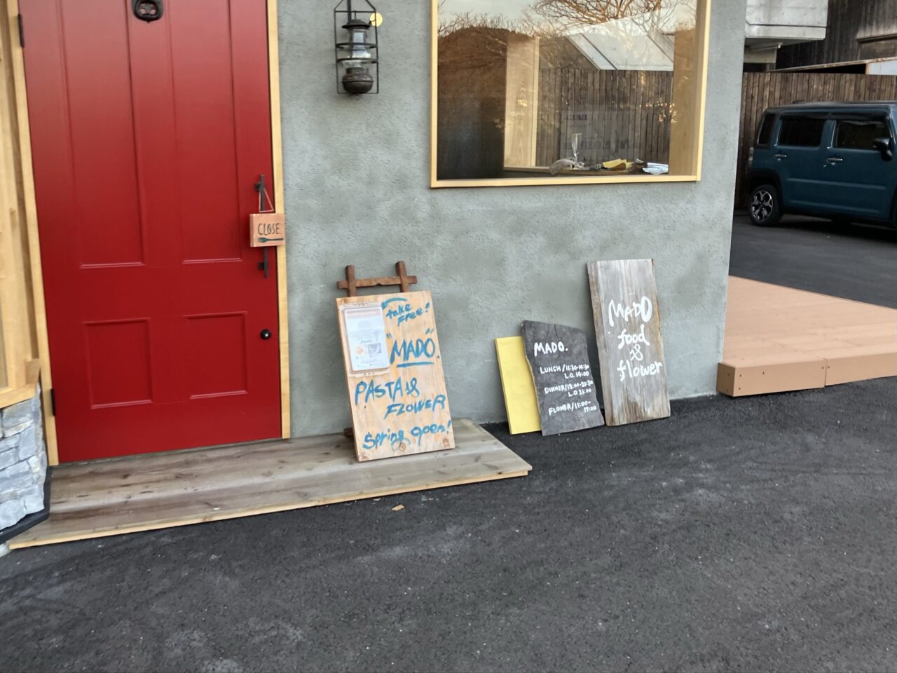 「花とパスタ」というユニークな組み合わせに加え、古民家を活かした空間づくりやロケーションも魅力の「MADO」。個性的な外観と真っ赤なドアがとっても可愛い!