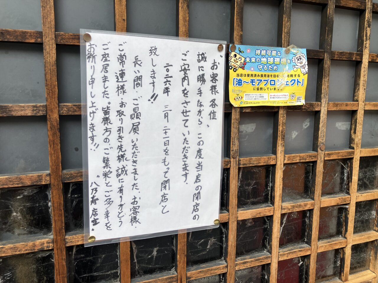 【松山市】二番町の居酒屋「八乃寿」が2026年3月21日に閉店。感謝のメッセージが掲示され、営業に幕。