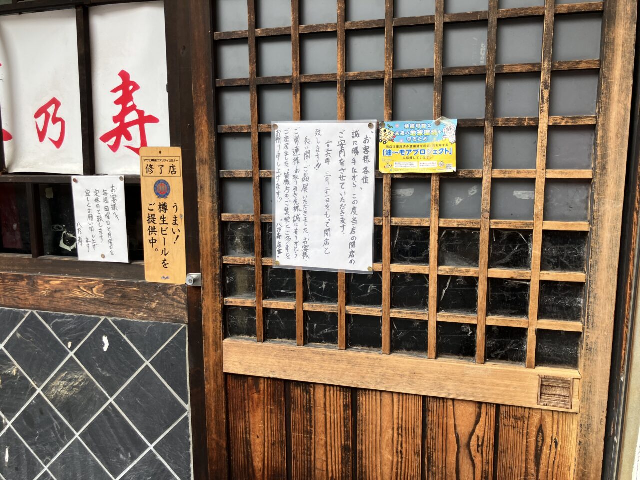 飲食店が立ち並ぶ中心部の一角で営業していた二番町の居酒屋「八乃寿」が、2026年3月21日に閉店していました。