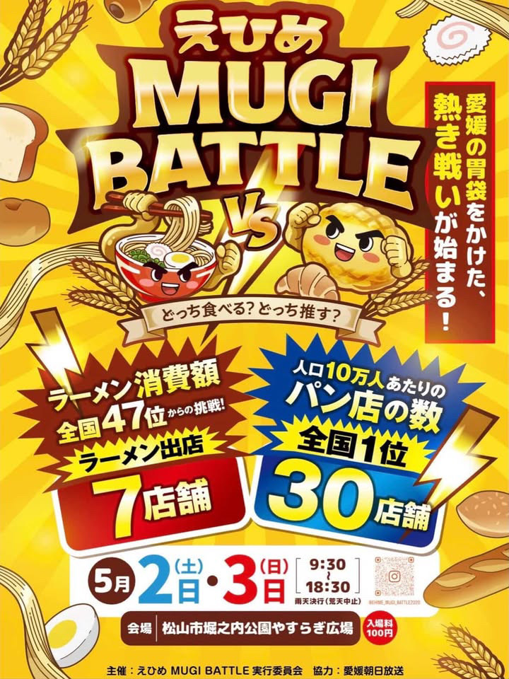 【松山市】パンVSラーメン!?前代未聞のグルメ対決「えひめMUGI BATTLE 2026」が2026年5月2・3日開催!城山公園に全国の人気店が集結。